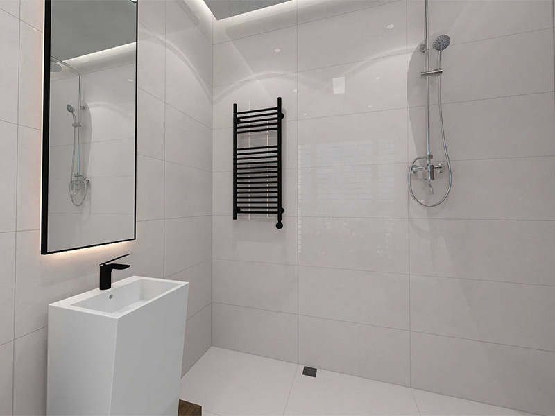 瓷砖表面细腻柔光,反射灯光柔和不刺眼;地漏处收口精致,无积水痕迹;墙面与地面转角处理流畅,无明显缝隙。